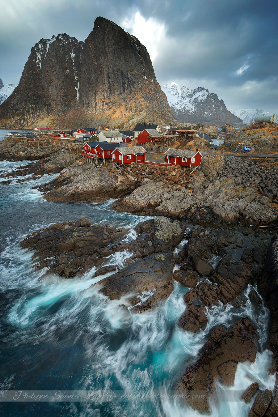 J’y croise un photographe de Toulouse, on bavarde un moment mais il est avec un groupe et continue son chemin et moi mes photos. La météo est encore bonne aujourd’hui et je me régale sur ce spot situé à Hamnoy à 5 minutes à peine de Reine dans la petite localité du comté de Nordland. Nous y sommes retournés 3 fois, voici quelques ambiances différentes… Les photos se font depuis un pont qui surplombe le village, ça explique l’angle des images en plongée. Je peux vous dire que sur ce pont le vent se déchaîne et c’est tant mieux car il provoque de belles vagues en contrebas. J’ai tenté quelques poses longues mais le vent souffle si fort que pour aujourd’hui j’ai abandonné !